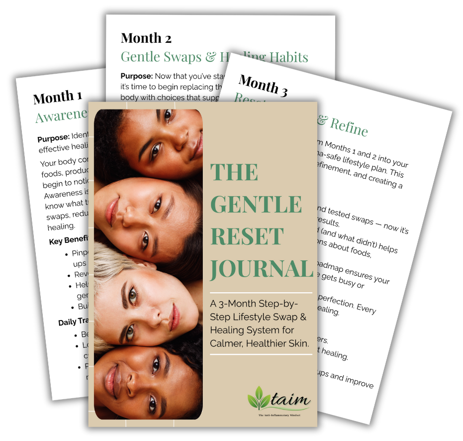 The Gentle Reset Journal helps you finally understand your triggers, calm inflammation naturally, and build daily habits that heal your skin from the inside out.Â